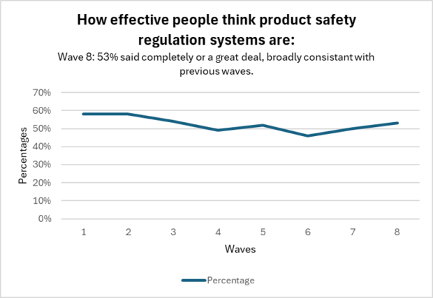 The main finding is the people who class product safety regulation systems as “completely” or “a great deal” effective has stayed consistent throughout the waves, shown in the graph below.