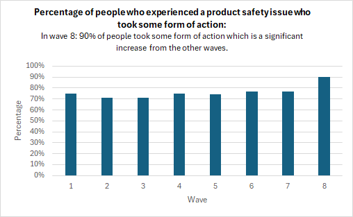 One key finding showed the main effects of a safety issue are distress/increased stress, which has increased from wave 1 to wave 8. The proportion of participants who took some form of action because of a safety issue has increased. This is important to OPSS as it may indicate that amongst consumers there is trust in OPSS procedures and there is value in acting when there is an issue with a product.